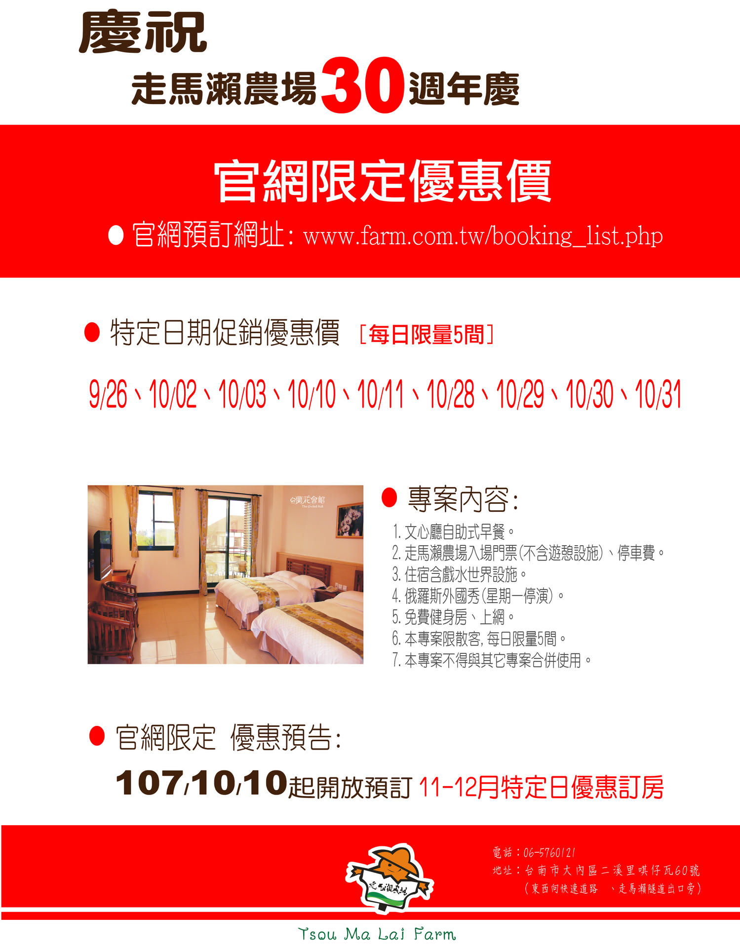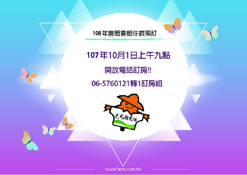 關於農場 走馬瀨農場為台南市農會全心經營的休閒農場,以專業種草起家,再轉型升級為觀光休閒農場,通過行政院農業委員會核發休閒農場許可證(證號333),並且為第一批獲頒合法風景遊樂區標章,並獲得多次優等及特優考核園區。2012年取得環境教育場域認證、2025年取得特用作物類(牧草)特色農遊場域認證 ,園區住宿蘭花會館(台南市旅館編號349)、歐式旅館(台南市旅館編號246)、度假木屋(台南市旅館編號345)皆合法取得旅館業執照,園區內亦擁有通過台南市政府核可之合法露營場。
